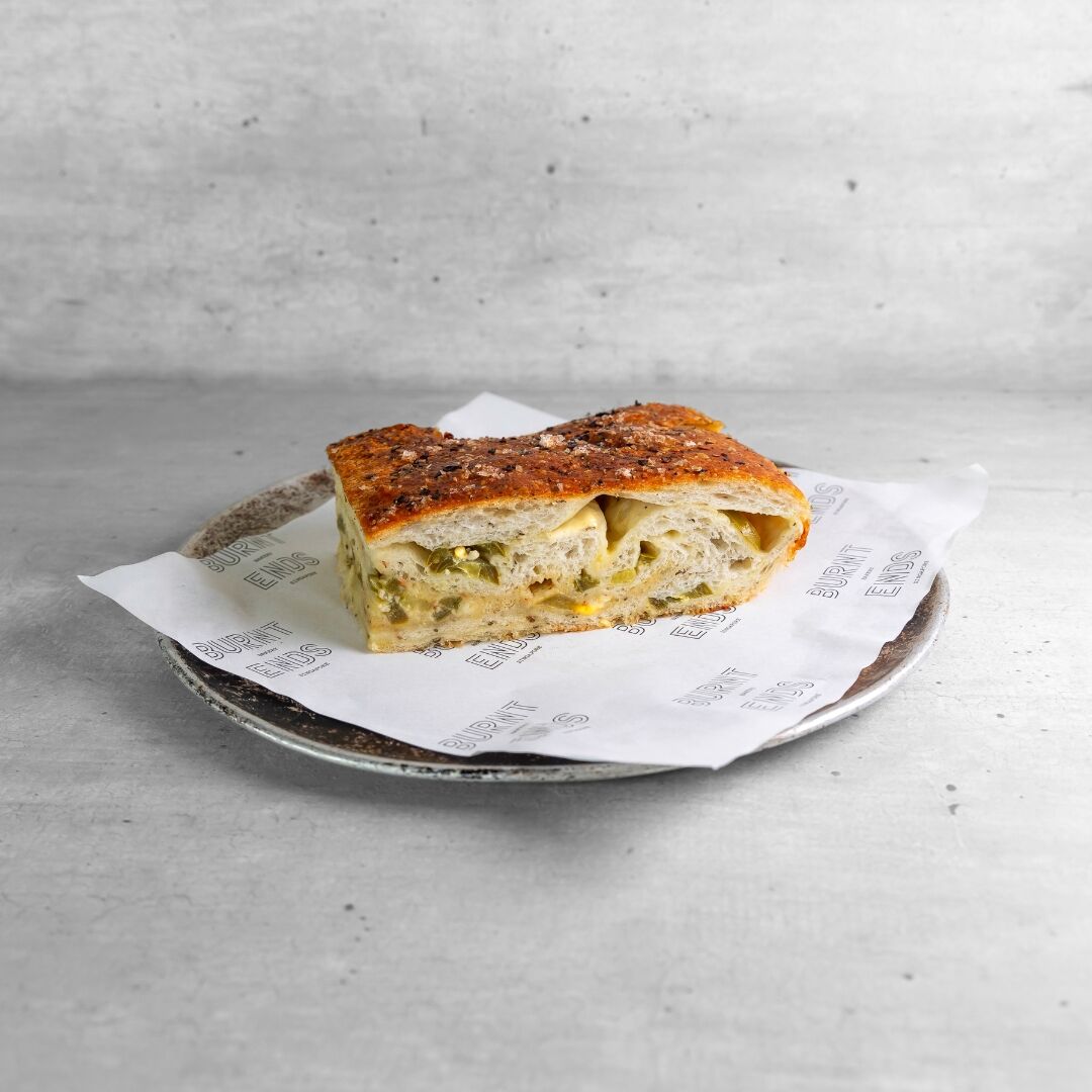 Jalapeño Cheese Focaccia Contains Jalapeño, Grueyère Cheese, Chilli Flakes, Black Pepper, Dry Herbs, Yeast and Salt.