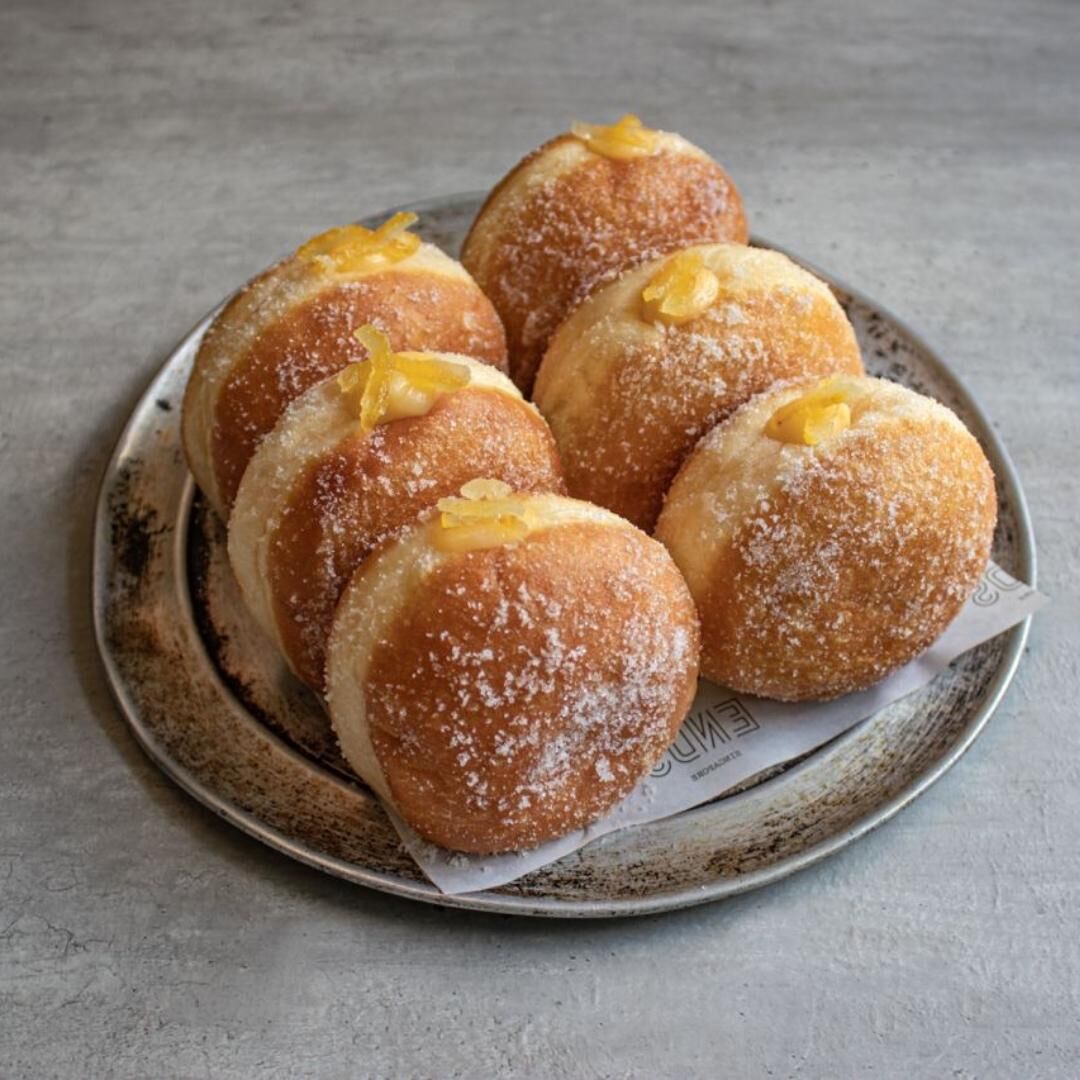 Smoked Japanese Yuzu Doughnuts filled with Yuzu Curd, and topped with Candied Yuzu Peels.